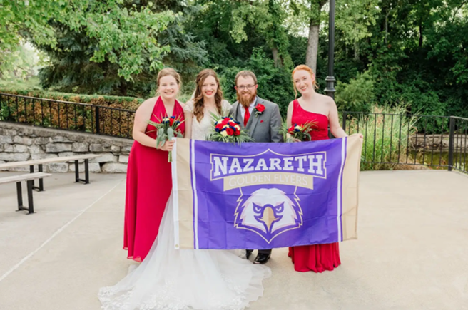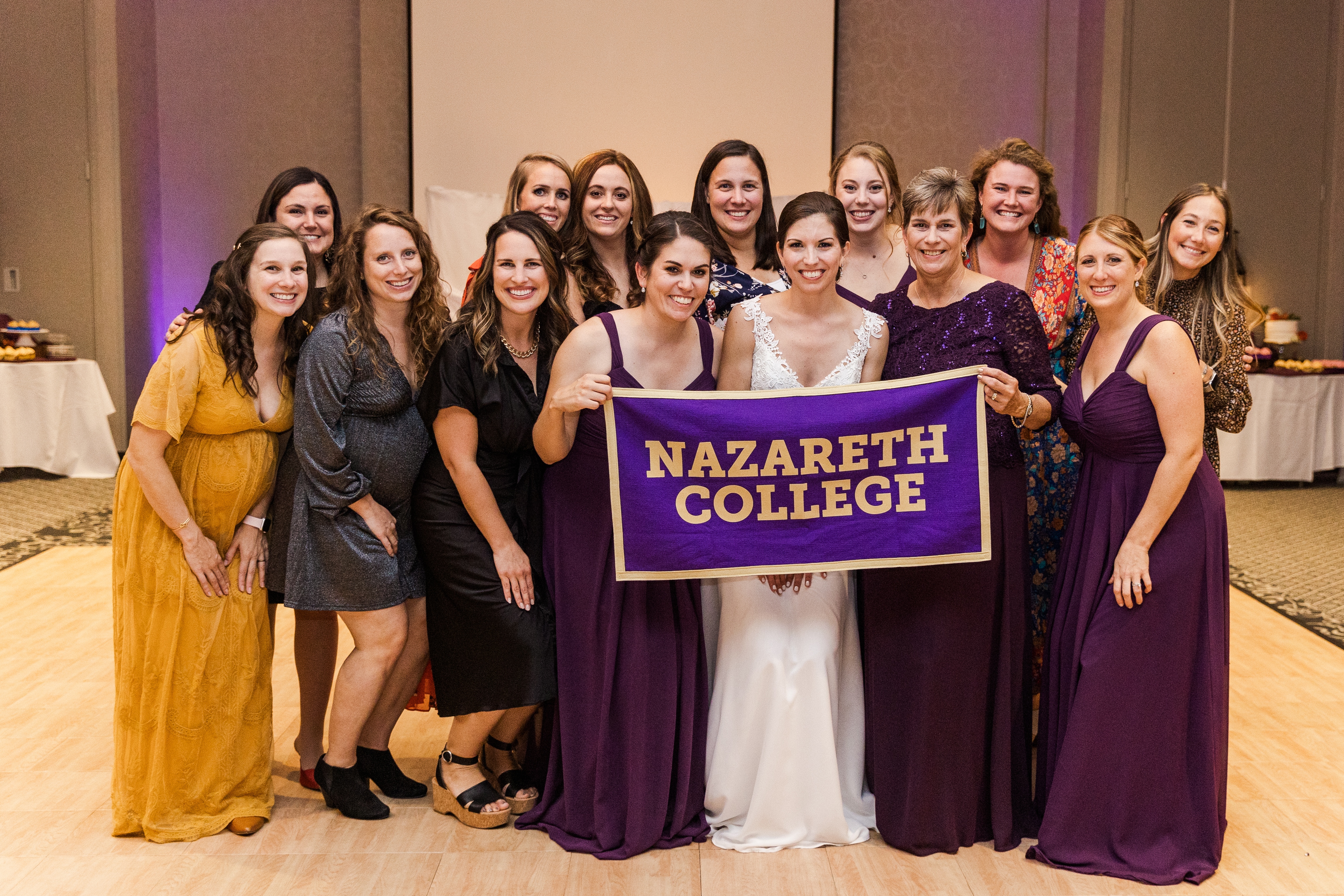 | Meghan Macri Lounsbury ’18, ’20G | ( | Health Sciences, Physical Therapy | ) | Married Dr. Steven Lounsbury `18, `20G on August 19, 2023 at Holy Cross Church in DeWitt, NY. Meghan and Steven met during their time at Nazareth in the Doctor of Physical Therapy program. Other alumni in attendance were bridesmaid Miranda Hagen `18 and Dr. Taylor Durocher Whitney `18, `20G. Their wedding had many references to their time together at Nazareth, such as their wedding colors (yellow/gold and purple) and their table markers, named after buildings on Nazareth’s campus. Meghan and Steven both work as physical therapists in the Syracuse, NY area and love to visit Rochester whenever they can! | ![]() | Meghan & Steven married on August 19, 2023 at Holy Cross Church in DeWitt, NY. |