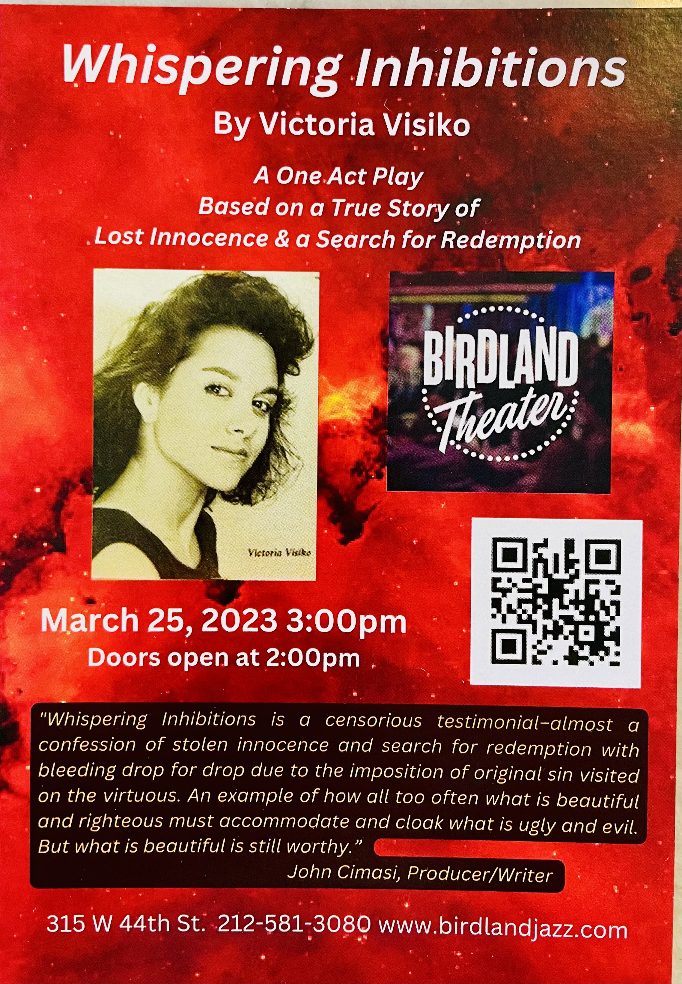 | Victoria Visiko ’83 | ( | Theatre Arts | ) | Has an original play, "WHISPERING INHIBITIONS". Her one act play is based on her true story of lost innocence and a search for redemption. This was the first play ever at presented at Off Broadway - NYC at Birdland Theatre on March 25, 2023! | ![]() | |